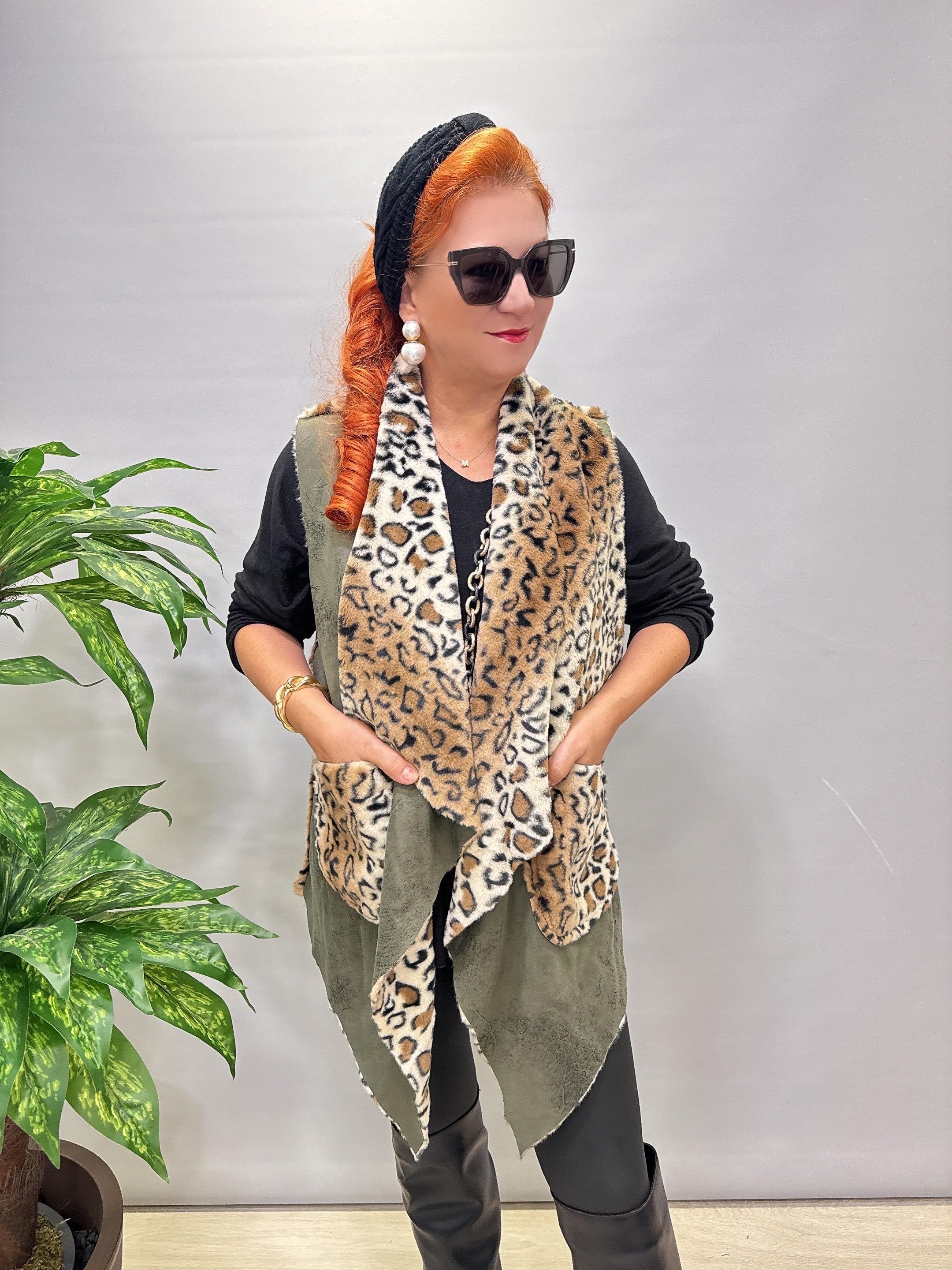 2885 Nubuk Detay İçi Kürk Yelek Haki