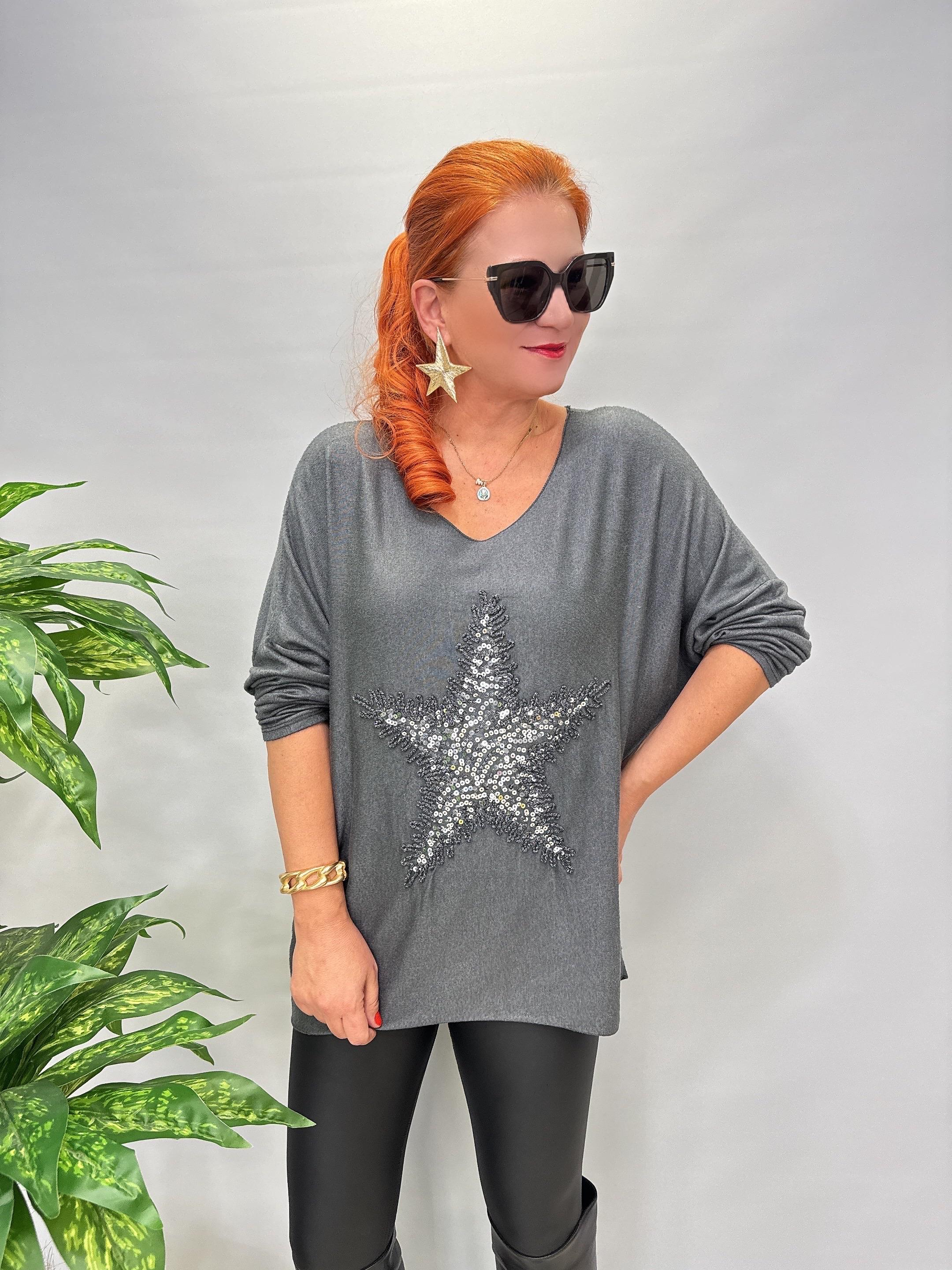 MNS 86511 İTALYAN LİKRALI YUMUŞAK YILDIZ PAYET DETAY BLUZ  46 BEDENE UYUMLU Antrasit