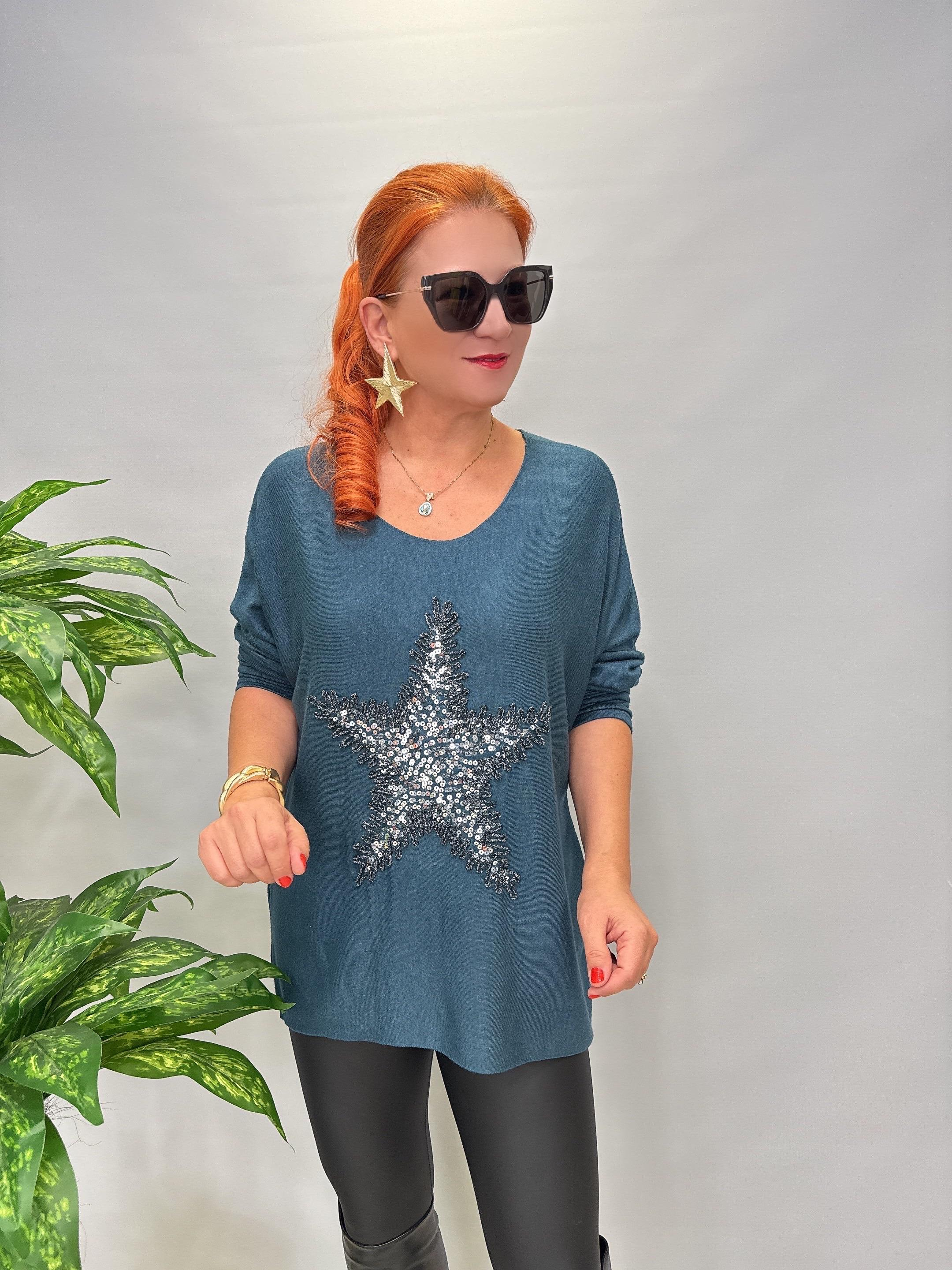 MNS 86511 İTALYAN LİKRALI YUMUŞAK YILDIZ PAYET DETAY BLUZ  46 BEDENE UYUMLU Petrol