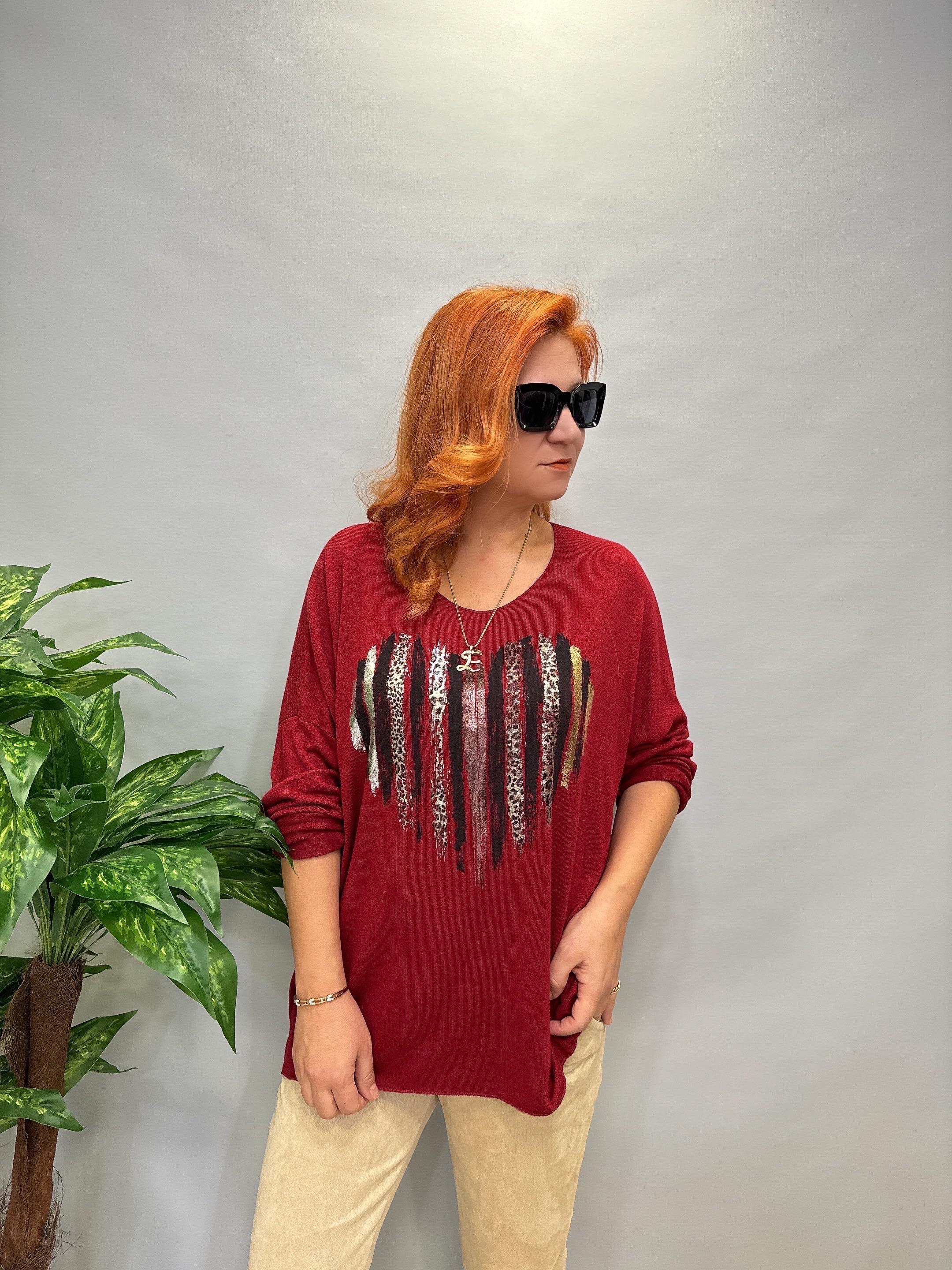 Mns 9025 İtalyan Zebra Kalp Detay Extra Yumuşak Triko Bluz Bordo 46 Bedene Kadar Uyumludur
